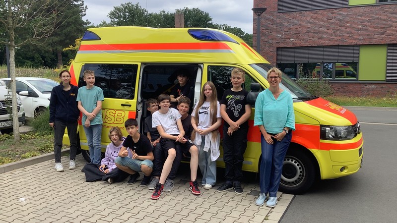 Noch im Juli hatte der WP-Kurs "Schulsanitäter" die Gelegenheit, den ASB zu besuchen. Bei dieser Gelegenheit lernten die Schülerinnen und Schüler die Ausstattung eines Rettungswagens kennen.